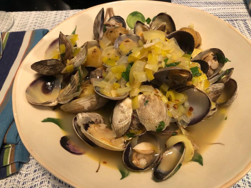 Day two is CSA meal day (Credit Hitchcock Restaurant Group for the recipe as well as the CSA goodies). The CSA included some manila clams and all the ingredients for a little clambake. “Clambake” is a bit of a misnomer as it is not baked in an oven. It is more of a moules frites situation, but with clams and fingerling potatoes. Sauté some leek and garlic with chili flake, then half a bottle of decent white wine goes in (the rest is chef’s treat, of course) along with the clams and the fingerlings that were previously steamed. Cook, shaking the pan occasionally so the clams open, release their juices and mingle with the wine. When the alcohol flavor has dissipated, taste for seasoning, “mount” with a good dollop of butter and stir so it is incorporated. Squeeze some lemon; toss in a handful of roughly chopped parsley, and have crusty bread for dipping.