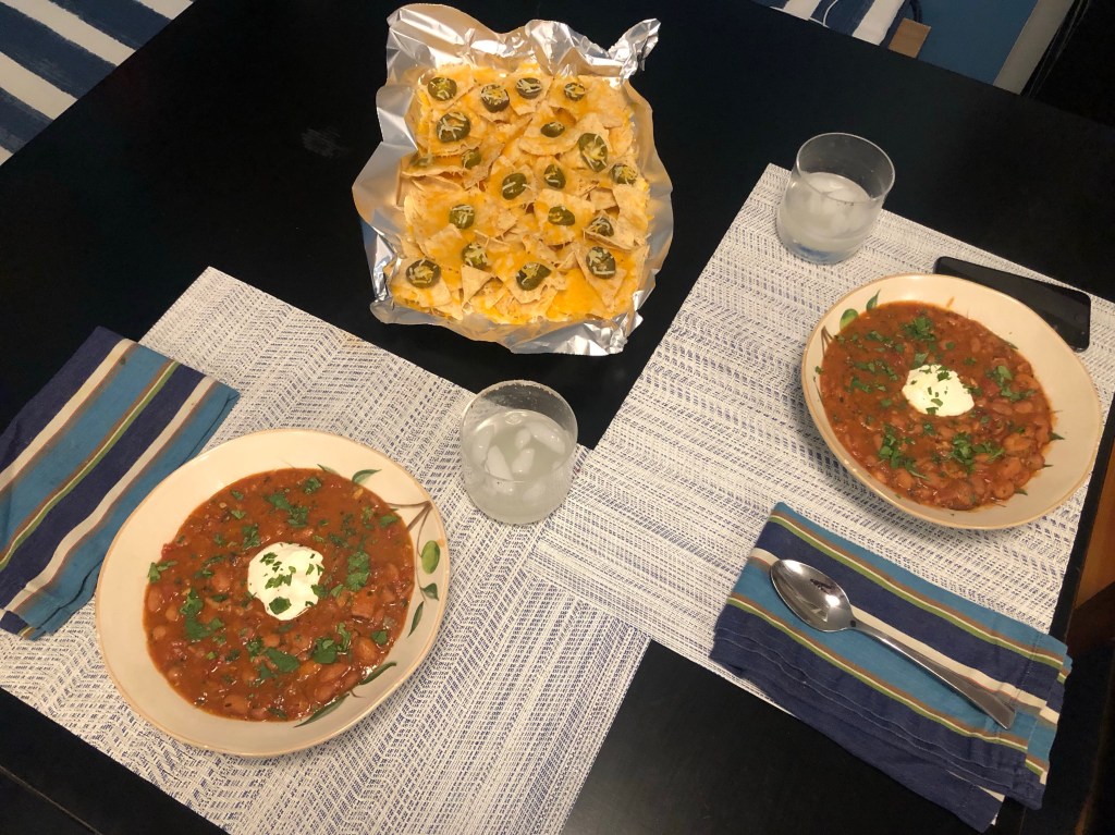 I had a bag of Rancho Gordo Cranberry Beans and read that they could be substituted for pinto beans in Frijoles Charros. I sauteed onion and serrano chilis with some chunky bacon that my Mom’s boyfriend Steve had smoked, homemade chicken stock, and fire-roasted canned tomatoes, along with the pre-soaked beans. All that goodness bubbled away in a dutch oven for about an hour. Then I served it with a dollop of sour cream and cheesy, pickled jalapeno nachos on the side.