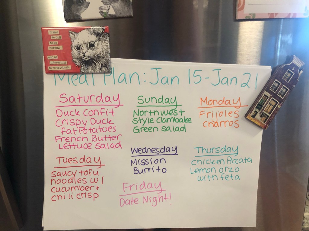 Each week, I meal-plan using a program called Notion that allows you to have different databases that are connected to one another. So I have my recipe database and my meal planning database. Throughout the week, I find recipes and save them in the recipe database and then, on Thursday or Friday, I plan meals for Saturday through the next Friday. My plan is usually a mix of new recipes and old favorites, online recipes and cookbook recipes. Sometimes I also write my meal plan up with colorful markers and post it on the fridge so Andrew knows what’s coming.