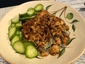 I was feeling like something a little different midway through my meal plan so I went vegetarian with this saucy tofu number over noodles. I also can’t say no to a dish that includes pickles. The “meat” of the dish was extra firm tofu, wringed out in a clean dish towel to get rid of as much liquid as possible and tossed in salt and pepper and cornstarch before frying in oil. When cooked, it really did have the consistency of ground meat! Add to that finely diced mushrooms and an unctuous sauce made of tahini, soy sauce, black vinegar, and chili crisp and you really do get an umami bomb of a “gravy” that clings to the ramen noodles. The whole dish is topped with a quick pickled cucumber and more chili crisp. This will definitely be on regular rotation. Note: The noodles are green because they are hippie Jasmine rice noodles from PCC.