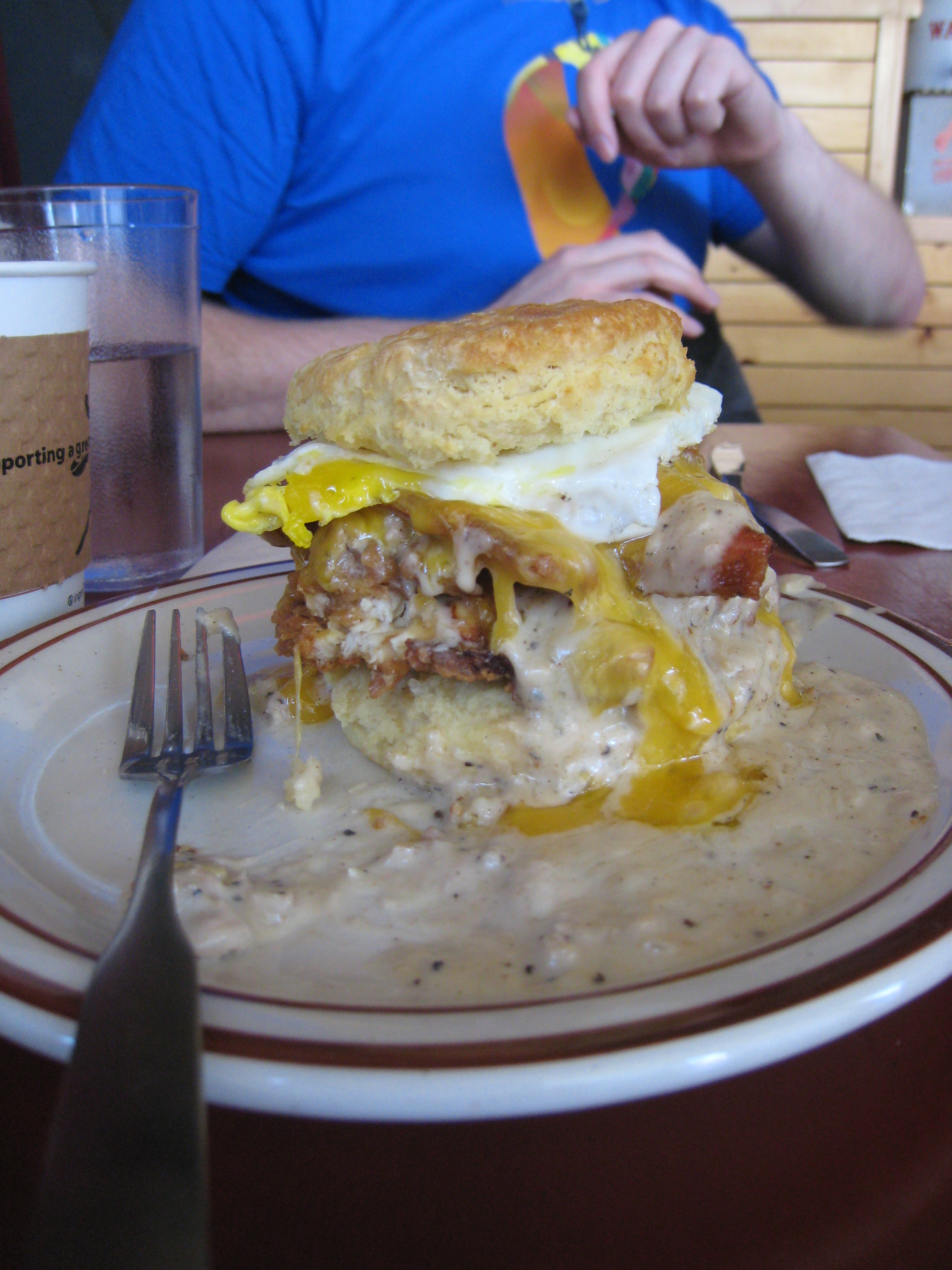 Fried Chicken, egg, bacon, cheese, gravy…need I say more?