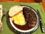 I like this steak because the flavor of the meat is totally enhanced by the red wine and mushrooms. You can still taste the meatiness of the steak but with the addition of the slightly tangy red wine and earthy mushrooms it becomes a more complete dish. A more perfect marriage of flavors is hard to find with so few ingredients.