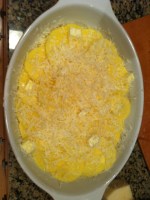 The Ingredients: two largish Yukon Gold potatoes (no others will do. The sweetness and texture of these potatoes really lend themselves to a dish like this. Other potatoes would be less flavorful and more likely to fall apart.), a cup of boiling whole milk, a couple handfuls of gruyere cheese (to taste), about 8 knobs of butter (4 tablespoons) plus some for greasing the pan, a clove of garlic, white pepper.